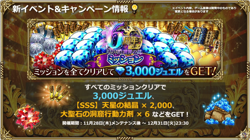 2024年11月28日(木)メンテナンス後~2025年1月4日(土)4:00の期間中のログインで最大45,000ジュエルが貰えます。