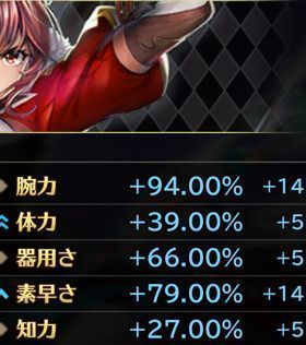 | 腕力 | +94%+14 | 知力 | +27%+5 |