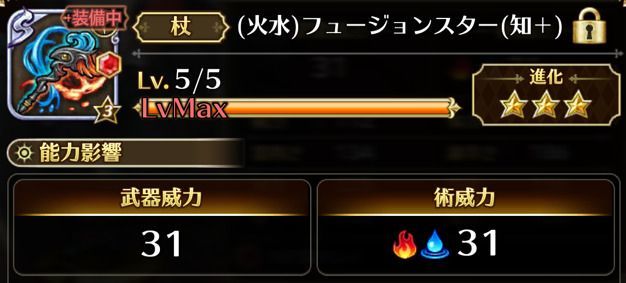 また、実装直後の現環境であれば、そもそも「霊銀の杖」が威力30/知力+7なので、ジョーの火力を優先する編成でフュージョンスターを外す理由も特にないです。