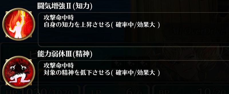 | 闘気増強Ⅱ | 攻撃命中時 自身の知力を上昇させる(確率中/効果大) |