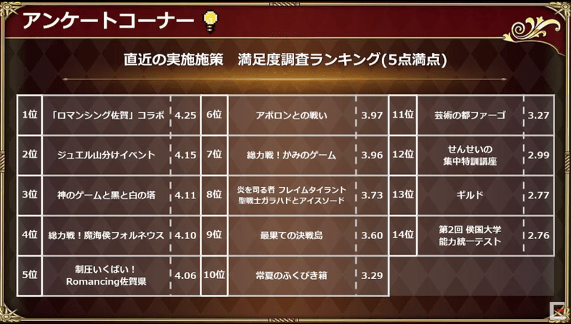 佐賀県とコラボした「ロマンシング佐賀コラボ」が4.25点で1位