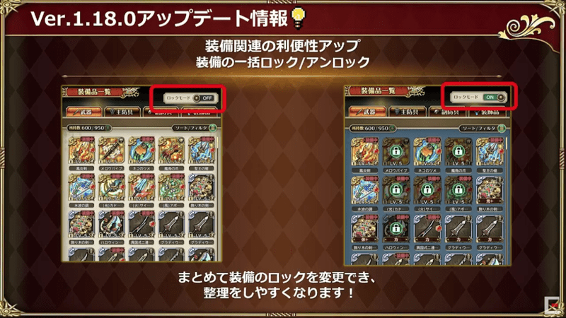 限定装備などを売却してしまわないように、自動でロックがかかる機能も検討中