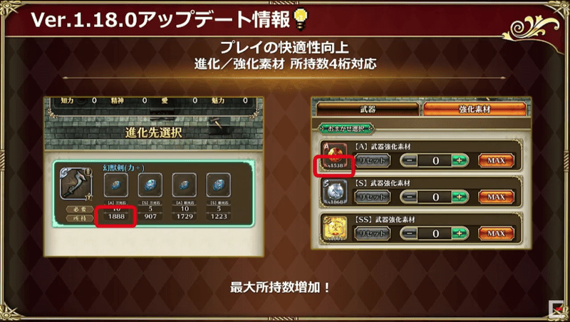 光石や武器、防具強化素材が最大9999個までストックできるように
