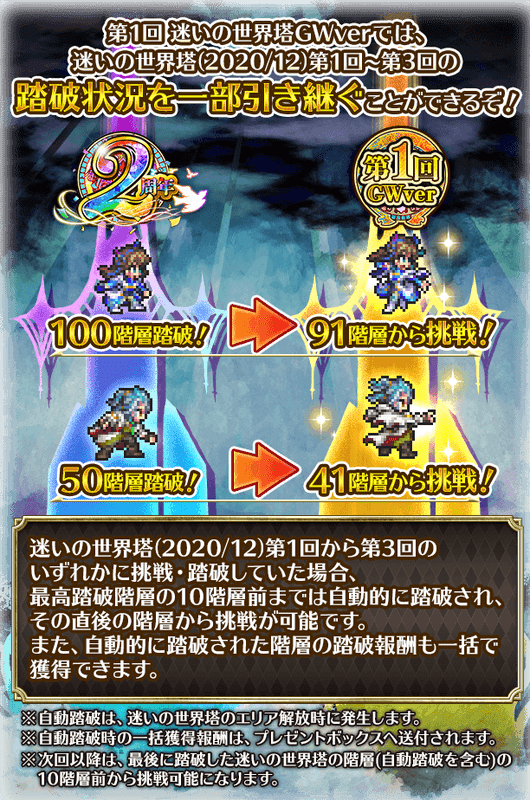 ロマンシングサガ リユニバース(ロマサガRS)のイベント「迷いの世界塔GWver」の攻略情報まとめです。イベントでやるべき事や難所の攻略情報、各階の報酬一覧を掲載しています。