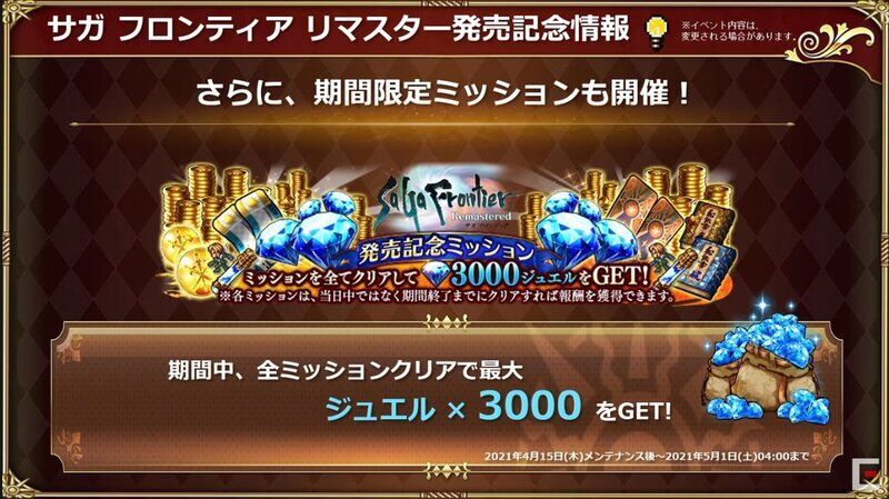 Android/iosどちらかのランキングでサガフロンティアが1位になれば2000ジュエル配布と公約してくれました。