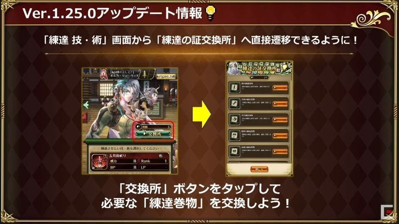 「練達技・術」画面から「練達の証交換所」へ移動遷移
