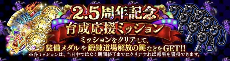 「2.5周年記念育成応援ミッション」の2日目以降は条件が変わらず「鍛錬道場クエストの20回クリア」が開放アイテムの入手条件になっています。