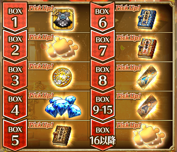 | ③ | 記念ボックスガチャチケで4箱目まで開封する |