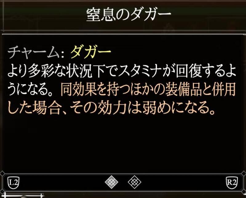 窒息のダガーはスタミナ管理の補助で役立つチャームです。このチャームを装備するとジャンプ中にもスタミナが回復するようになり、スタミナ切れになりにくくなります。普段使いでも便利なほか、ローリングやジャンプを多用する場面でも有用です。