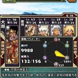 軍略 不屈の南蛮王 毎ターンHPを極小減少させ、全武将の攻撃力を3.5倍。味方の「蛮兵」武将の回復力を2倍にする(最大HPの4%の固定ダメージを受ける)
