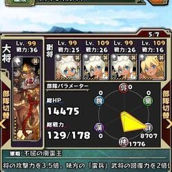 一回目 不屈の南蛮王【壱】 毎ターンHPを極小減少させ、全武将の攻撃力を4倍。「蛮兵」の回復力2倍。受けるダメージを大きく減少
