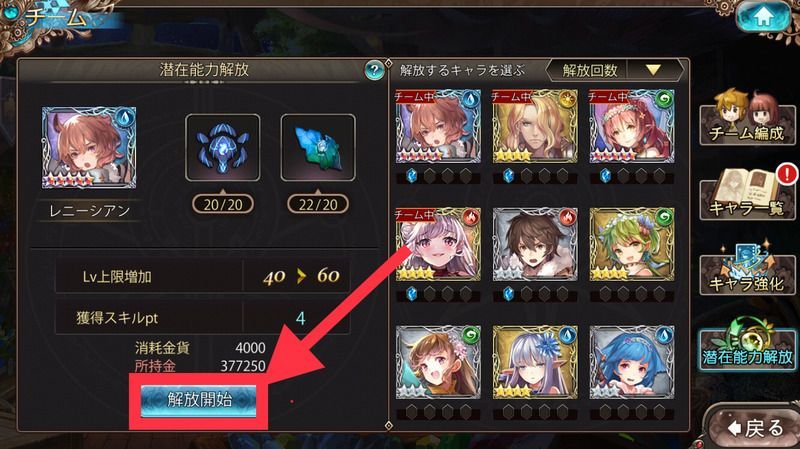 潜在能力解放(限界突破)させたいキャラを選択し、潜在能力解放用の素材と金貨を引き換えに、解放することができます。