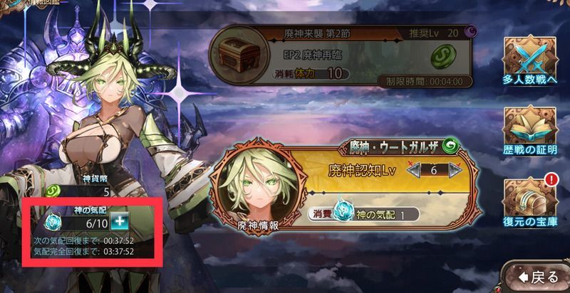 廃神ウートガルザに挑戦するために必要な「神の気配」の回復は1つにつき60分とやや長めなので、回復していたら挑戦して消費するなど、常に消費している状態をキープすると効率良く神貨幣を集めることができます。