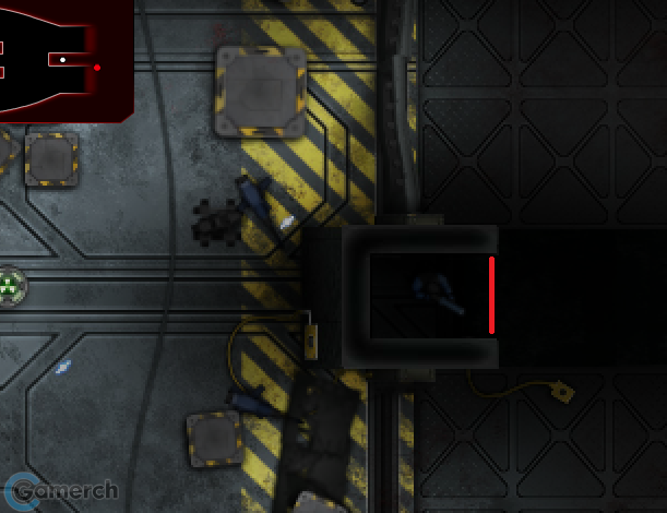 ![]() | 2つ目のリアクタールーム停止後に行けるエリアであり、マップ上では中央下(3つ目のリアクターの下)となる。 隠し部屋上の扉(画像黄色枠)を破壊すると出現。 因みに手前の部屋はガストラップ部屋であるため、扉の破壊はリアクターの部屋から行うと良い。 ステージ開始時中に入って下のエリアに進行すればこの部屋の前まで来れるが、 ドアの電源が落ちている為、リアクターを最低2つ停止しなければ、ドアの解放はされない。 |