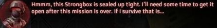「うーむ、このストロングボックスはきつく閉じられている。このミッションが終わった後でゆっくり開くとしよう。生き残ればだが・・・。」
