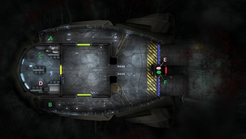 残り時間1:00にマップ左のドア(画像黄色線)が開き、入室可能になる。C地点にはランダムアイテム、D地点には回復アイテムが置いてある。