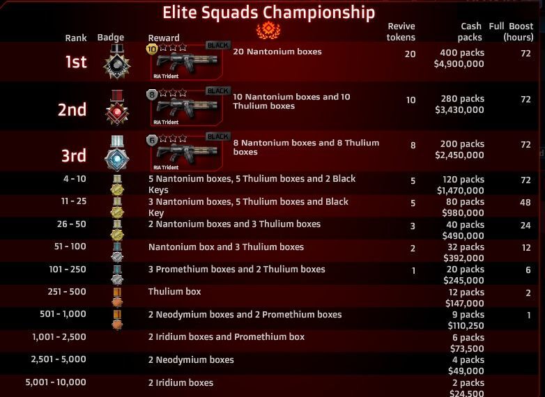 その他にも順位に応じてRevive Token、Mission Power-Upsの無料フルブースト、上位のStrongbox、大量のAlloyやSAS Cashを手に入れる事が出来る。