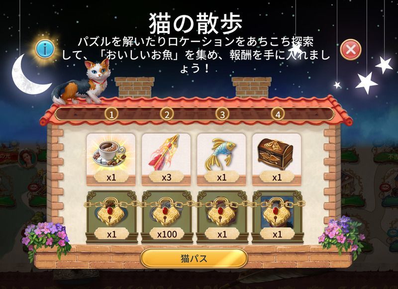 - ロケーションや「おばけの光」「宝箱」のパズルをクリアし「おいしいお魚」を集めると報酬が貰える