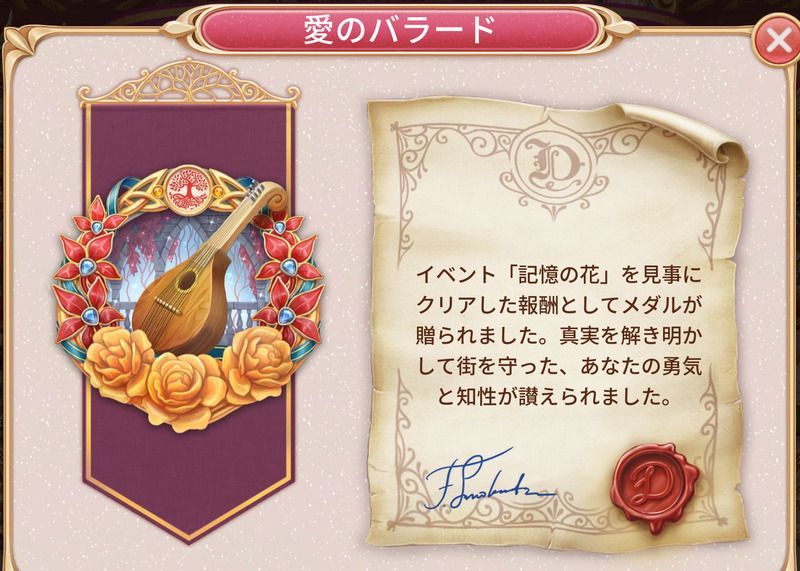 | クリア | 高貴な贈り物x1(チェスト) ハートの記憶x1(デスクの装飾品) |