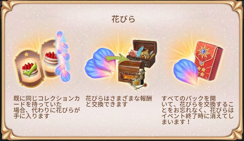 - カードパックのカードがすでに持っているカードと重複した場合 後から手に入った重複カードはさまざまな報酬と交換できる花びらに引き換えられる