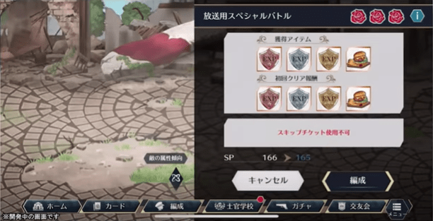 主にEXP(カードのレベルを上げるもの)を獲得する目的として行い、アプリではスキップチケットを用いてアイテムを獲得することも可能になるようです。開発中の情報です。