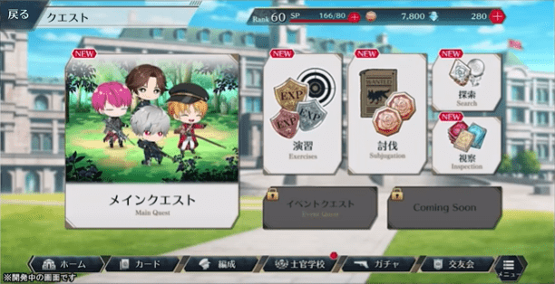 千銃士Rでは、「クエスト」、「ストーリー」、「Shop」、「Room」、「カード」、「編成」、「士官学校」、「ガチャ」、「校友会」など様々な要素があります。