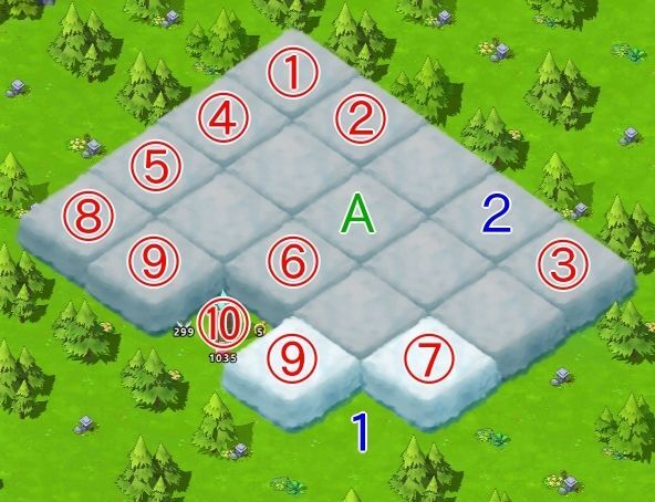 赤の数字は敵施設の位置、青の数字は自分のスタート位置となります。