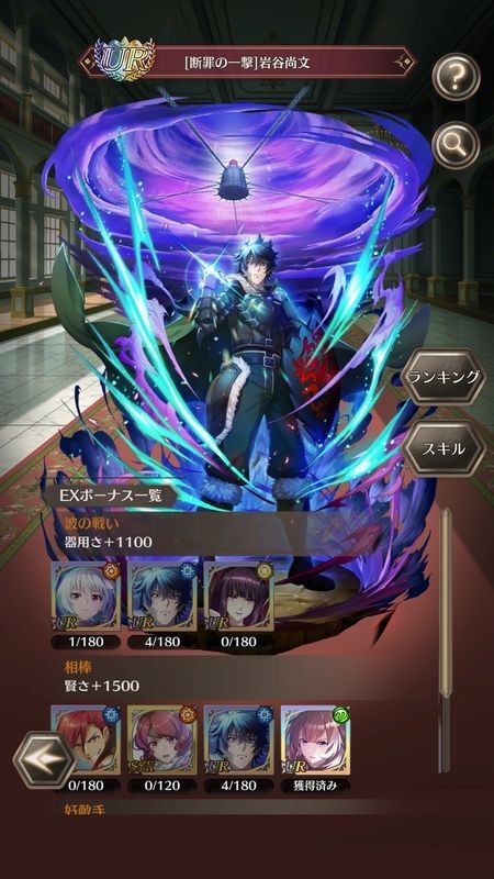 | 物理攻撃 | HPが低い敵1体に240%の物理ダメージを3回与え、2ターンの間、自身に回避率を25%上昇させる。 | バトル中に1度だけ、HP2以上の時にダメージを受けてもHP1で攻撃を耐える。バトル中に1度だけ、自身のHPが50%以下になった時、HPが低い味方3体のHPを35%回復し、物理防御力を25%上昇させる。 | 自身の物理攻撃力が75%上昇する。 | 味方に[岩谷尚文]がいる時、自身の物理攻撃力が75%、会心率が25%上昇する。 | |
