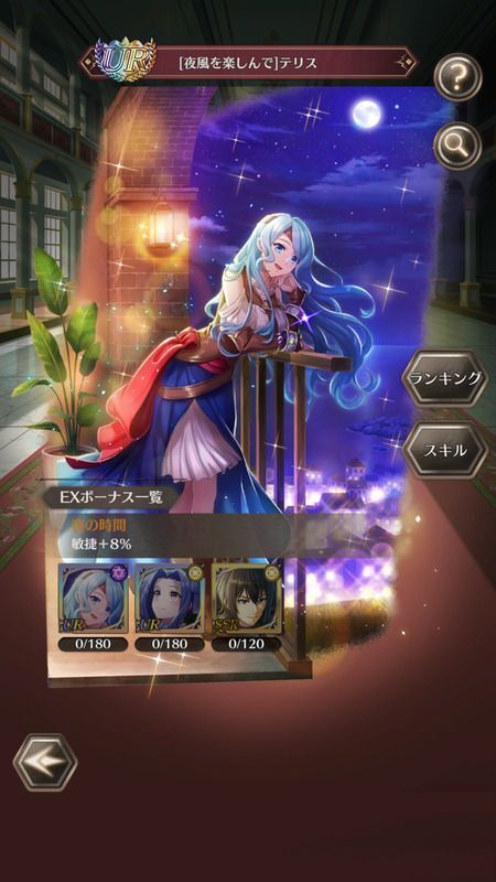 | 物理攻撃 | 敵4体に250%の物理ダメージを与え、60%の確率で1ターンの間、[拘束]状態にする。 | 敏捷が高い敵2体の敏捷を50%低下させ、50%の確率で、更に敏捷が高い敵2体の敏捷を100%低下させる。 | 自身の物理攻撃力と会心率が70%上昇する。 | 自身の敏捷と物理攻撃力が80%上昇する。味方に[テリス]がいる時、1ターンの間、自身の敏捷が100%上昇する。 | |