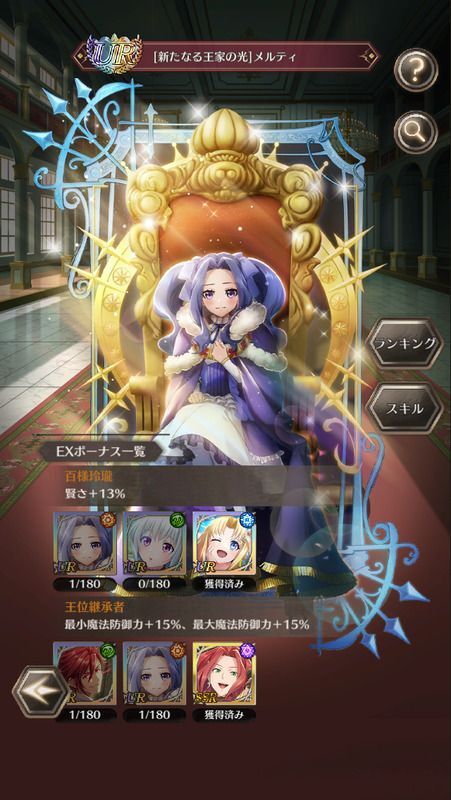 | 敵のスキルを自身に集中させる。バトル中に1度、HP2以上の時にダメージを受けてもHP1で攻撃を耐える。自身のHPが50%以下の時、1度だけ自身のHPが100%回復し、自身の魔法防御力が100%上昇する | |