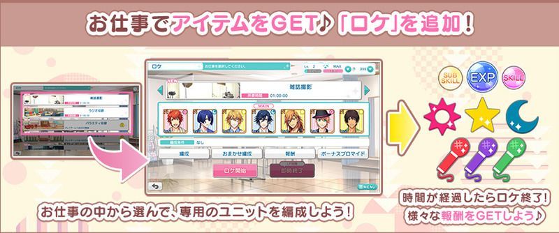 2020秋のアップデートで追加された新機能で、ブロマイドの設定と時間の経過だけで報酬を獲得できるシステム。LPを消費することでロケを即時終了させ、報酬を獲得することもできる。