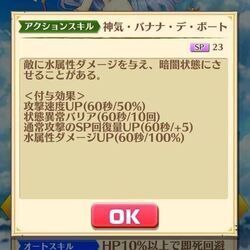 | 敵に水属性のダメージを与え、暗闇状態にさせることがある。 <付与効果> 攻撃速度UP(30秒/50%) 状態異常バリア(30秒/10回) 通常攻撃のSP回復量UP(30秒/+5) 消費SP:23 | |