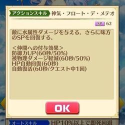 | 敵に水属性ダメージを与える。さらに味方のSPを回復する。 <仲間への付与効果> 防御UP(30秒/50%) 被物理ダメージ軽減(30秒/50%) HP自動回復(60秒) 自動復活(60秒/50%/1クエスト1回まで) 消費SP:62 | |