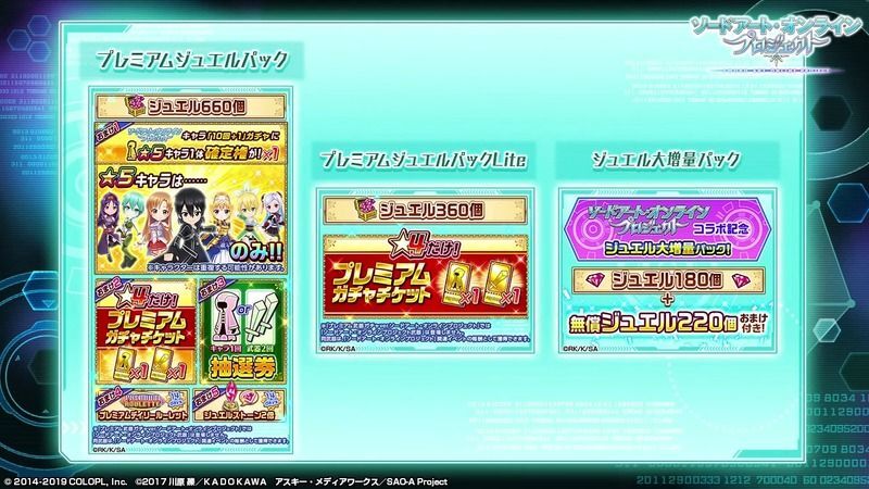 SAOコラボで実装されるプレミアムジュエルパックの購入特典に、コラボ星5キャラ1体確定権を手に入れることができます。課金を視野に入れている人にとっては非常にうれしい特典となっています。