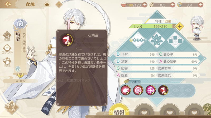 鵠羹(ふーげん)は、HPの回復、デバフの浄化や無敵化など、低レアリティの中でも補助役として使いやすく、編成全員の獲得経験値を5%上げることができるスキルを所持しています。序盤を攻略していく上では非常に便利なスキルで、効率良くレベルを上げることができます。