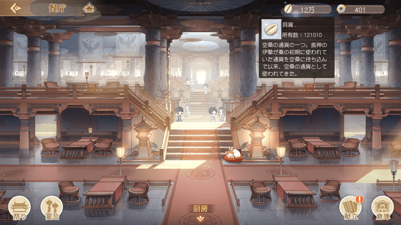 荘園は、「農場」で食材を作り、「厨房」で料理を作成、「餐庁」で料理を提供することで貝貨を入手できます。「餐庁」は、料理を追加していれば勝手に提供・支払いを行っていき、提供した料理に(茄子の油煮など)よって貝貨数が変わっていきます。