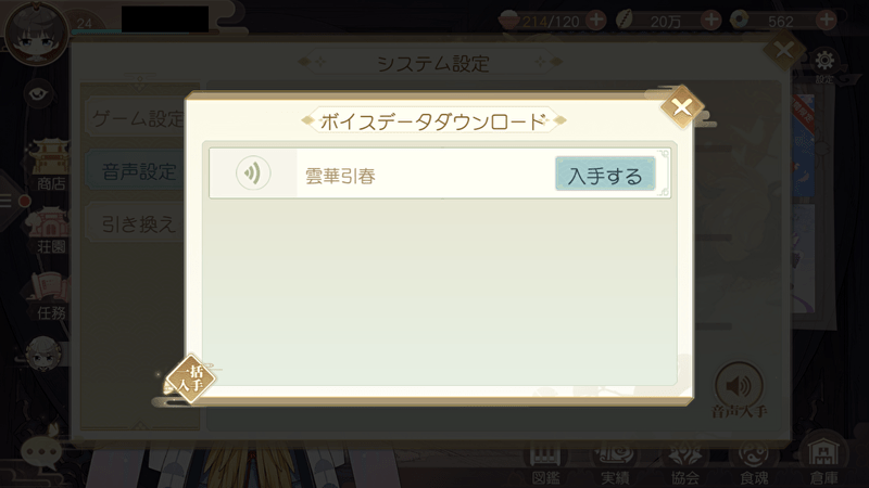 もし、イベントストーリーのボイスダウンロードをスキップしてしまった場合、ホーム画面>右上の設定(歯車マーク)>音声設定>音声入手>雲華引春からダウンロードできます。