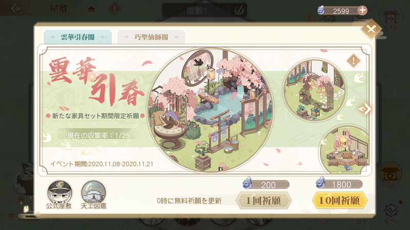 屋敷では「雲華引春」が開催されています。期間限定の家具が排出される祈願となっており、限定商店にラインナップされている家具も「雲華引春」に含まれています。