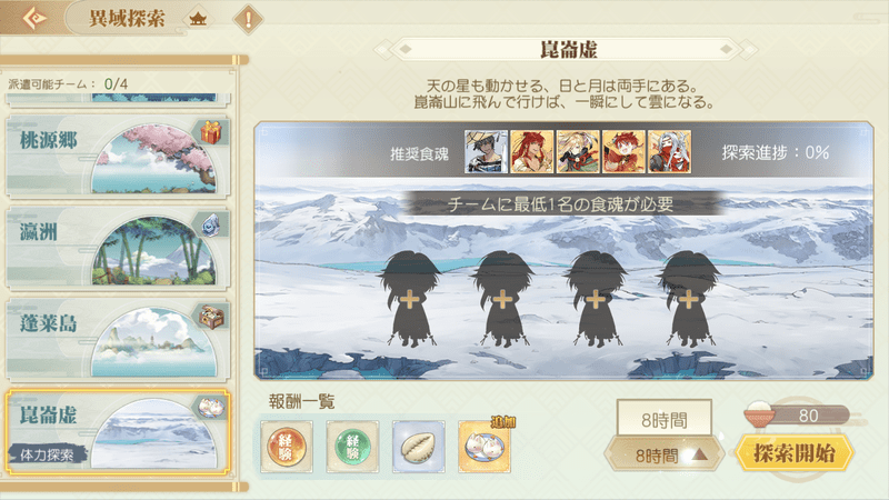 異域の中に1つだけ体力を消費する「崑崙虚」が存在します。体力×80と8時間を使って、他の異域より豊富な報酬を獲得することができます。
