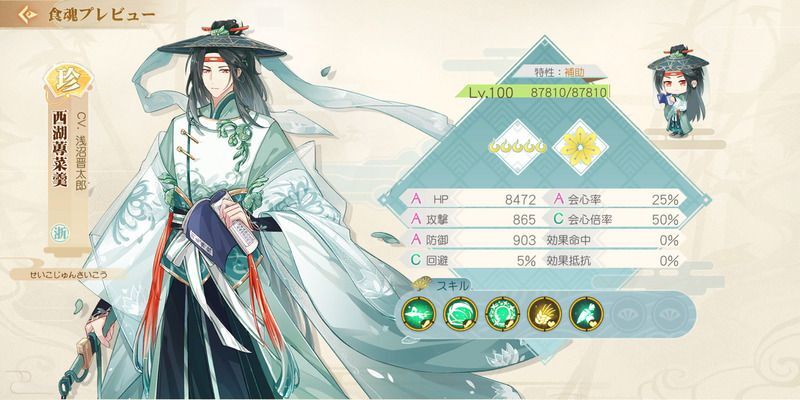![]() 民を守る剣 | 単体 引退の身でありながらも、民や国を憂う。刃を抜くのは、天下のためのみ。味方のチームメイトを指定し、3ターンの間、身隠しさせる。HPが50%未満の場合、HPを10%回復する。自身のHPが50%未満の場合でも、同じ効果を得る。西湖蓴菜羹のHPが50%未満の場合、発動時目標と同様のバフを獲得する。【初期冷却1ターン】【スキル冷却5ターン】 |