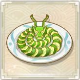 | 制作方法(工夫) | 1 胡瓜を洗って皮をむく、 切れないようにスライスす る。 2砂糖を二分に分けて、 一部は皿の底に振る。 3切ったきゅうりを砂糖の上に龍の形に模して並べる。 4上に残りの砂糖をまぶす。 |