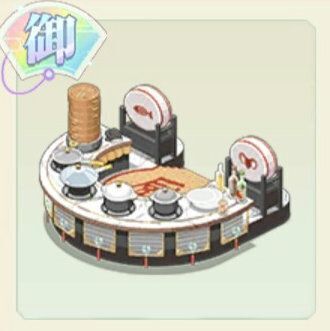 ![]() | 瑠璃がモチーフの家具。 ある人のためだけに準備された料理バトルリング。五味を蔵し、美食は天下を一つにする。従来のリングを改造してできた料理バトルリング。各地から来た賓客との調理バトルをいつでも迎え撃つ。ゴングが鳴り、様々な美味しい料理の香りが立ち込める。それは挑戦を受ける王者が最も満足する瞬間。 |
