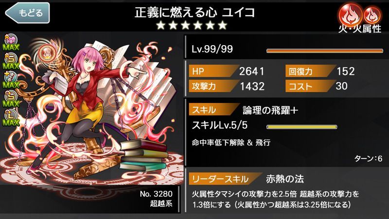 | 詳細 | 味方の火属性と超越系タマシイの攻撃力が2.5倍になる 【リーダースキル変化後】赤熱の法 火属性タマシイの攻撃力を2.5倍 超越系の攻撃力を 1.3倍にする(火属性かつ超越系は3.25倍になる) |
