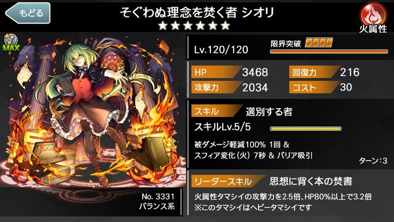 | 詳細 | 火属性タマシイの攻撃力を2.5倍、HP80%以上で3.2倍 ※このタマシイはヘビータマシイです |