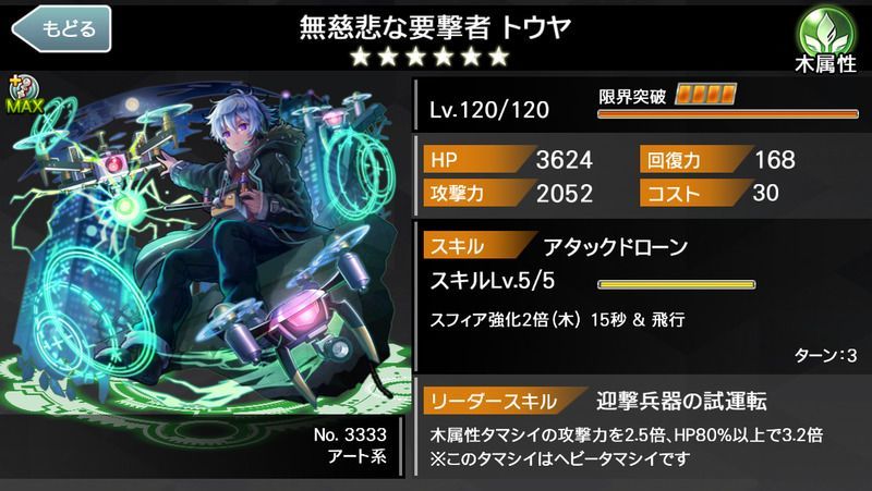 | 詳細 | 木属性タマシイの攻撃力を2.5倍、HP80%以上で3.2倍 ※このタマシイはヘビータマシイです |