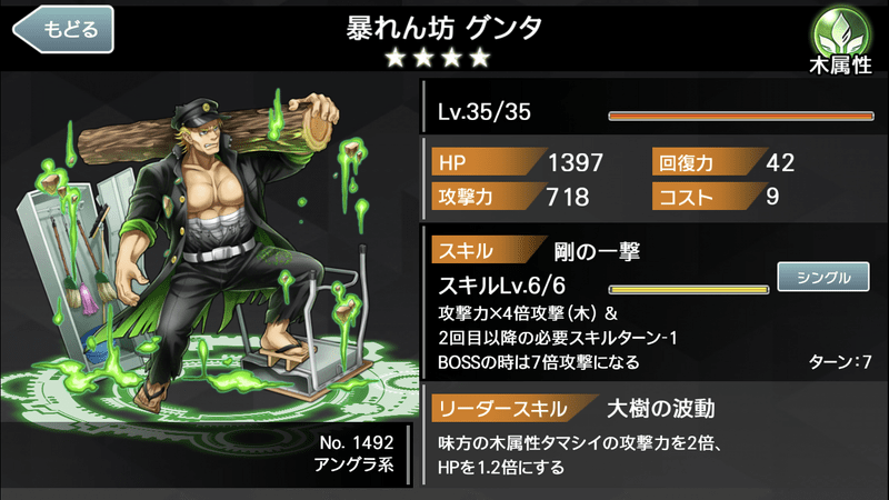 | 詳細 | 攻撃力×4倍攻撃(木) & 2回目以降の必要スキルターン-1 BOSSの時は7倍攻撃になる |