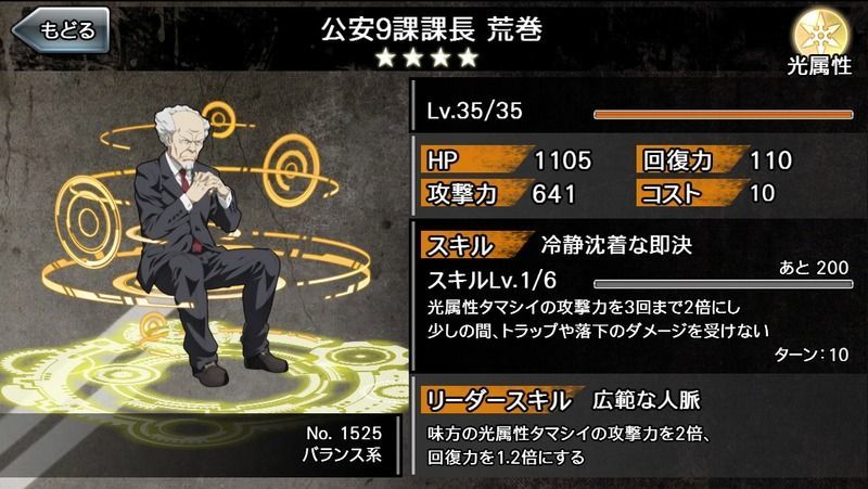 | 詳細 | 味方の光属性タマシイの攻撃力を2倍、 回復力を1.2倍にする |