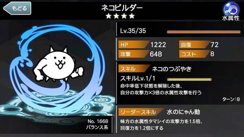 | 詳細 | 味方の水属性タマシイの攻撃力を1.5倍、 回復力を1.2倍にする |