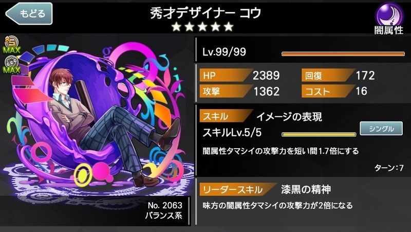 | 詳細 | 闇属性タマシイの攻撃力を45秒間2.5倍にする |