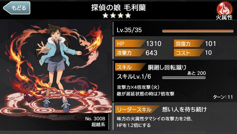 | 詳細 | 味方の火属性タマシイの攻撃力を2倍、 HPを1.2倍にする |